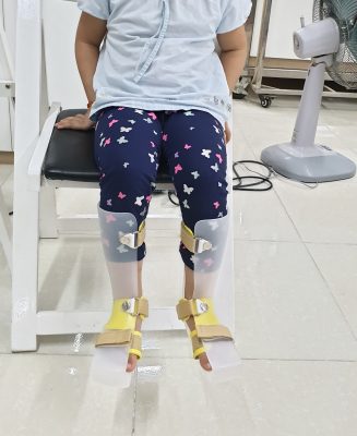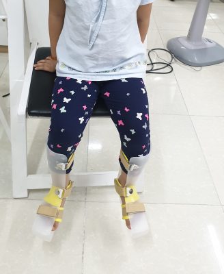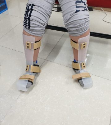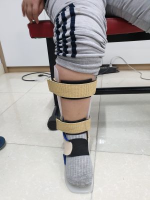 Sau khi thăm khám, căn cứ vào tình hình thực tại của em lúc đó, chỉ định phù hợp nhất là dùng nẹp dưới gối AFO kéo giãn bằng pit tông thủy lực. (Dựa trên tình trạng co cứng ở từng giai đoạn sẽ điều chỉnh ti thủy lực một lực cho phù hợp để có thể đeo cả ngày or mấy tiếng/ngày).